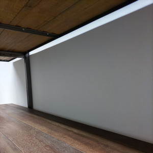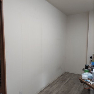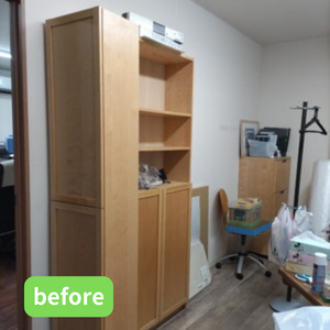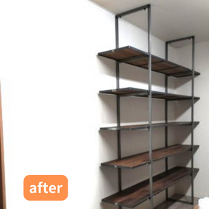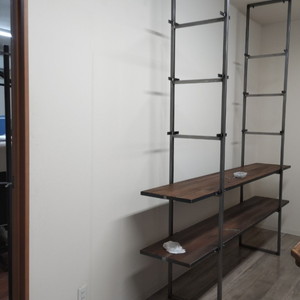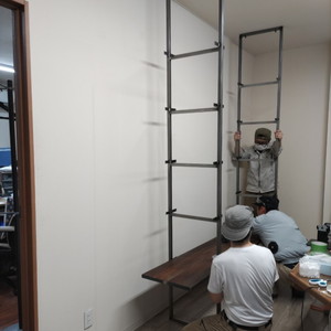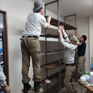 | できあがったものを組立・設置しています。 骨組みが天井ギリギリまであるので倒れてくる心配はありません。 サイズをしっかり合わせられるのが既製品にはないハンドメイドの強みですね。 |