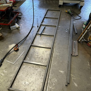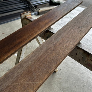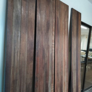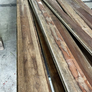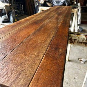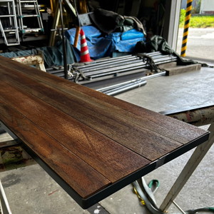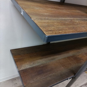 | 設置場所の計測をし、骨組みと天板を製作していきます。天板として使用するのは、解体した建物から頂いた床材です。廃材は使い込まれている分仕上がりに味がでます。今回積極的に活用しています。 |